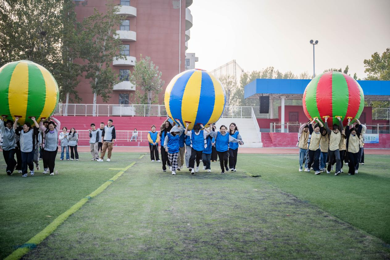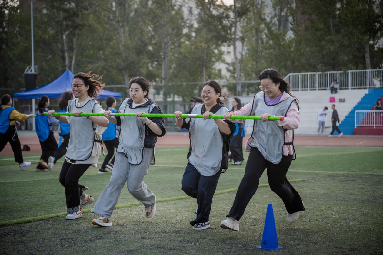 活动通过“反口令”“齐眉棍”热身并完成抽签分组,7支队伍快速完成团队创建与亮相后,核心拓展环节正式开启。“无敌风火轮”“巨人脚步”“运转乾坤”“旋风少年”“团体动力圈”五项特色活动接连上演,队员们或合力推动道具、同步突破障碍,或传递器械、协作完成绳上挑战,全程默契配合、彼此支援,现场呐喊助威声此起彼伏。比赛胜负之外,同学们更在一次次协作中拉近距离,收获了珍贵的默契与友谊。