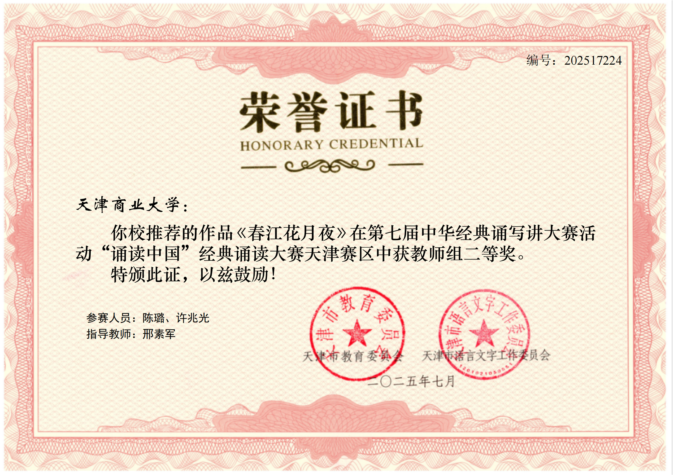 近日,第七届中华经典诵写讲大赛落下帷幕,beat365教师选送的朗诵作品获得“诵读中国”经典诵读大赛天津赛区教师组二等奖一项。