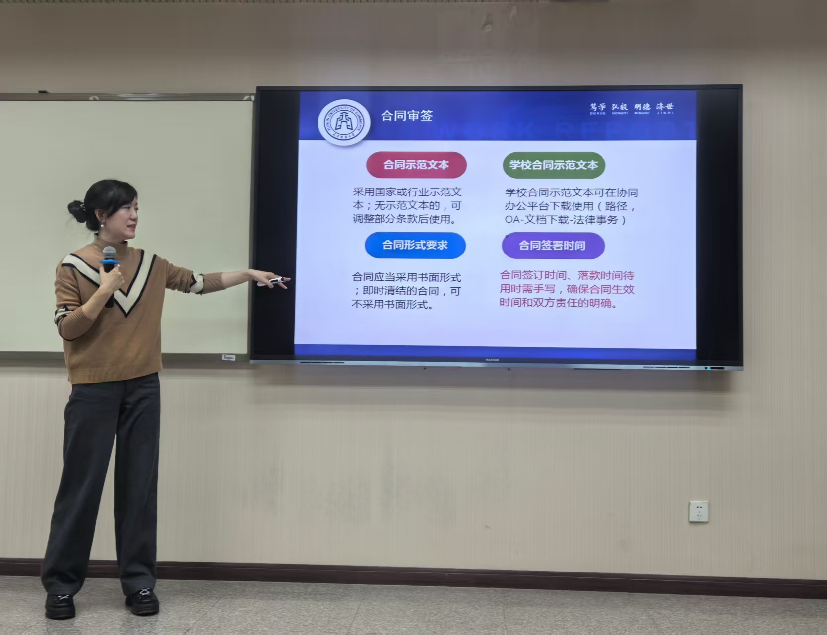 吕姝洁系统介绍了beat365依法治校的制度框架与运行机制,结合工作实际,对合同审签的核心流程、关键节点与常见风险进行了细致剖析,通过典型案例提示合规审查与风险防范的实操要点。强调合同审签不仅是必要的管理程序,更是教师保护自身、规范履职的重要屏障,引导大家从入职之初就筑牢法治根基、恪守契约精神,将“依法执教、规范履职”内化为自觉的职业操守。