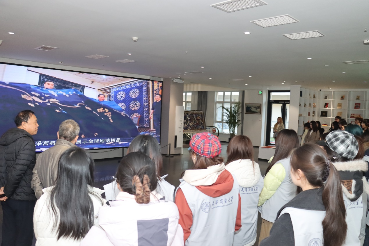 崔黄口镇地处京津冀交会枢纽,拥有逾百年地毯编织历史,技艺积淀深厚,匠人群体庞大。在当地传统产业升级政策支持下,武清地毯业坚持“守正创新”——既坚守传统手工技艺精髓,又积极引入高端化、智能化、绿色化新技术。在崔黄口国际地毯文化展览馆——“织采宫”,公共管理学院杨琪副教授现场教学,为同学们梳理了中国地毯技艺从传统到现代的发展脉络。馆内翔实的史料与丰富的案例,生动述说着地毯匠人世代相传的智慧与文化的绵延不息。学生们近距离观摩手工地毯织造的全流程,鉴赏从传统经典到融汇中外的特色作品,切身感受地毯艺术的独特美学价值与精湛工艺。“非学无以广才,非志无以成学。”本次现场教学不仅是一堂生动的美育课,更是一堂深刻的专业实践课。传统产业的可持续发展,正呼唤着青年一代深入一线,以创新的思维推动古老技艺与现代消费潮流深度融合,从而为实现文化传承与产业升级的双赢格局贡献青春力量。