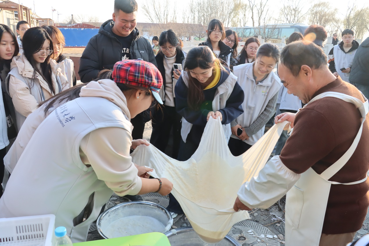 师生调研行第二站抵达历史文脉悠长的蓟州区上仓镇裕泉庄村,同学们走进了“北方江南农坊”。该农坊依托“燕子李三故里”文化IP,通过场景复原与民俗雕塑,系统展示了传统孝义文化与民间生活智慧。一场别开生面的豆腐制作实践课,更是让青春的双手与古老的智慧相遇。选豆、推磨、滤浆、点卤……在非遗传承人的指导下,同学们分组协作,忙得不亦乐乎。推动石磨的劳作、缓缓流淌的豆浆、升腾弥漫的豆香,让同学们在沉浸式体验中,直观感受到了传统技艺蕴含的质朴智慧与匠心魅力。本次活动不仅是一次技艺的体验,更是一次文化的浸润。同学们深刻体会到“精益求精、顺应自然”的工匠精神内核,认识到传统技艺作为“乡土文化活化石”的宝贵价值。通过亲手触摸非遗的温度,让大家更真切地理解了传承的意义,坚定了以青春力量助力文化延续与乡村振兴的信念。