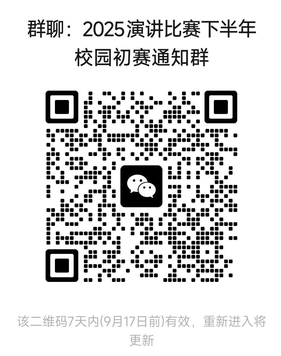 定题演讲:选手以大赛公布的定题演讲题目Strike the Waves(击水中流,破浪前行)为依据,自拟小标题录制3分钟英语脱稿演讲视频,并在规定时间内通过超星学习通进行提交,详情请扫码进群并关注群通知(定题演讲题目介绍请见大赛官网https://ucc.fltrp.com/c/2025-03-22/529100.shtml)。