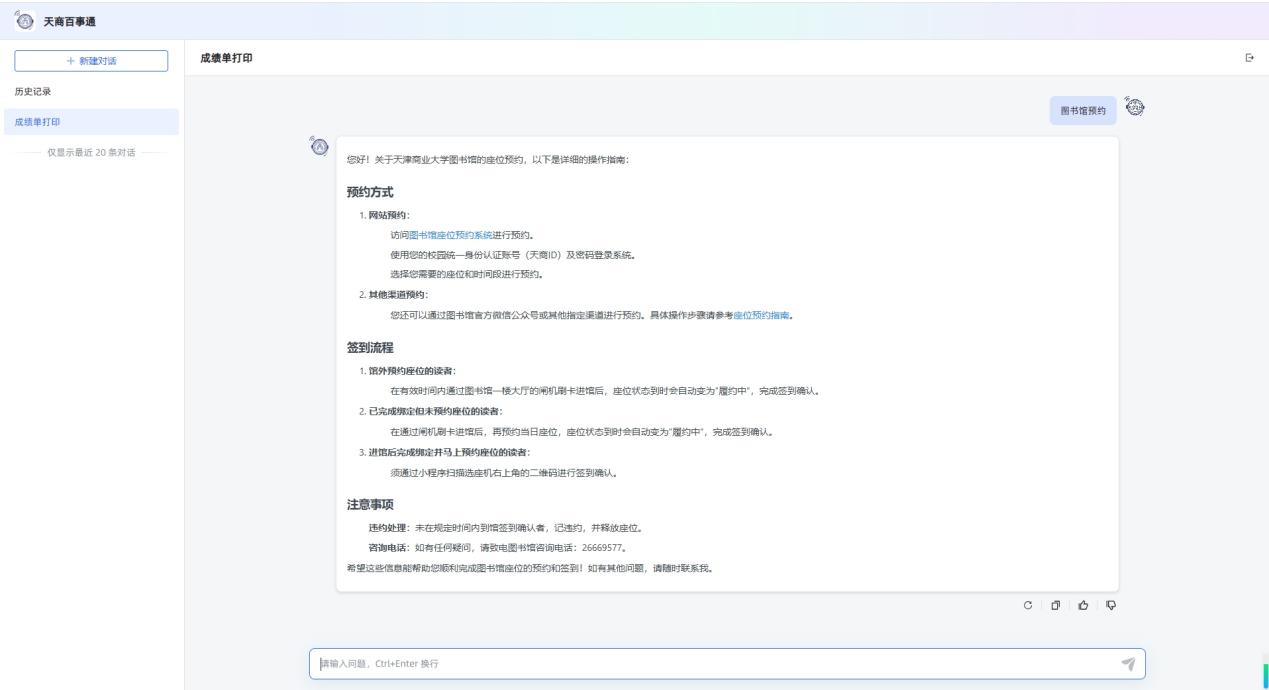 为深入贯彻落实学校第三次党员代表大会提出的“数智赋能战略”要求,全面推进学校教育数字化转型和高质量发展。近期学校基于DeepSeek-R1/V3(671B)大语言模型技术,依托本地化智能体平台创建学校专有知识库,开发了“天商百事通”应用。该应用提供了学校管理规范、办事流程、信息查询等场景的智能问答服务,旨在为师生提供便捷化、精准化、智能化的校园服务。