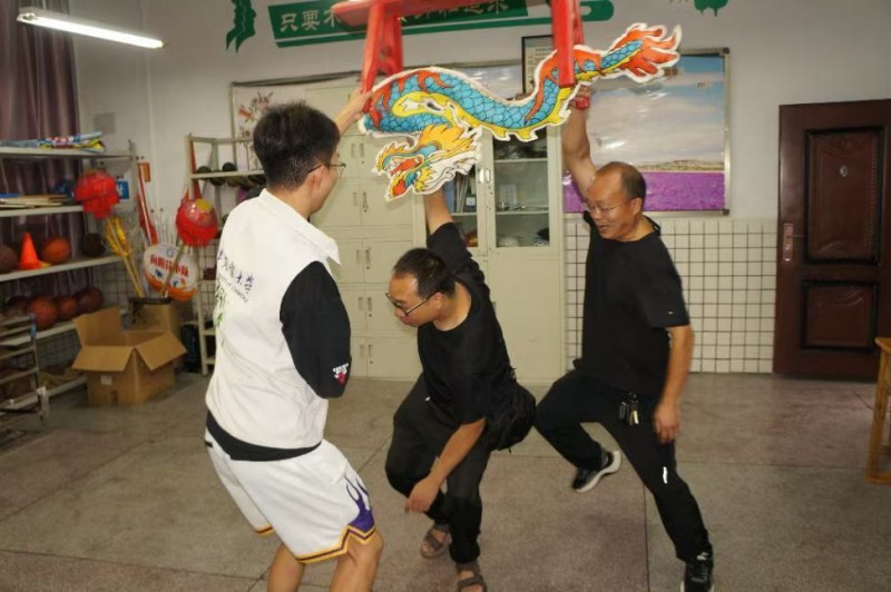 在南川区石溪镇中心校小学,团队成员见到了非遗民俗舞蹈“板凳龙”的传承人夏传红老师。这项起源于1876年的重庆市非物质文化遗产,正以充满朝气的姿态在校园中焕发新生。穿过挂满板凳龙舞各种奖项的展示长廊,团队来到非遗陈列室。各式各样的板凳龙道具陈列其间:竹篾与稻草编织的传统草龙质朴粗犷,泡沫填充的练习龙轻便灵巧,而专为小学生设计的塑料小板凳龙仅有巴掌大小,红黄相间的鳞片在灯光下熠熠生辉。实践队员们在训练场亲身体验了这项古老技艺。个人舞讲究即兴发挥,队员举起板凳舞起来便觉重心不稳,踉跄几步才勉强稳住;最难的三人穿插舞步中,队员反手穿凳时屡屡卡顿,险些摔倒。“板凳龙舞需要千百次练习,非遗传承的精髓就在‘熟能生巧’四字。”夏传红扶正队员手中的龙具,娓娓道来。
