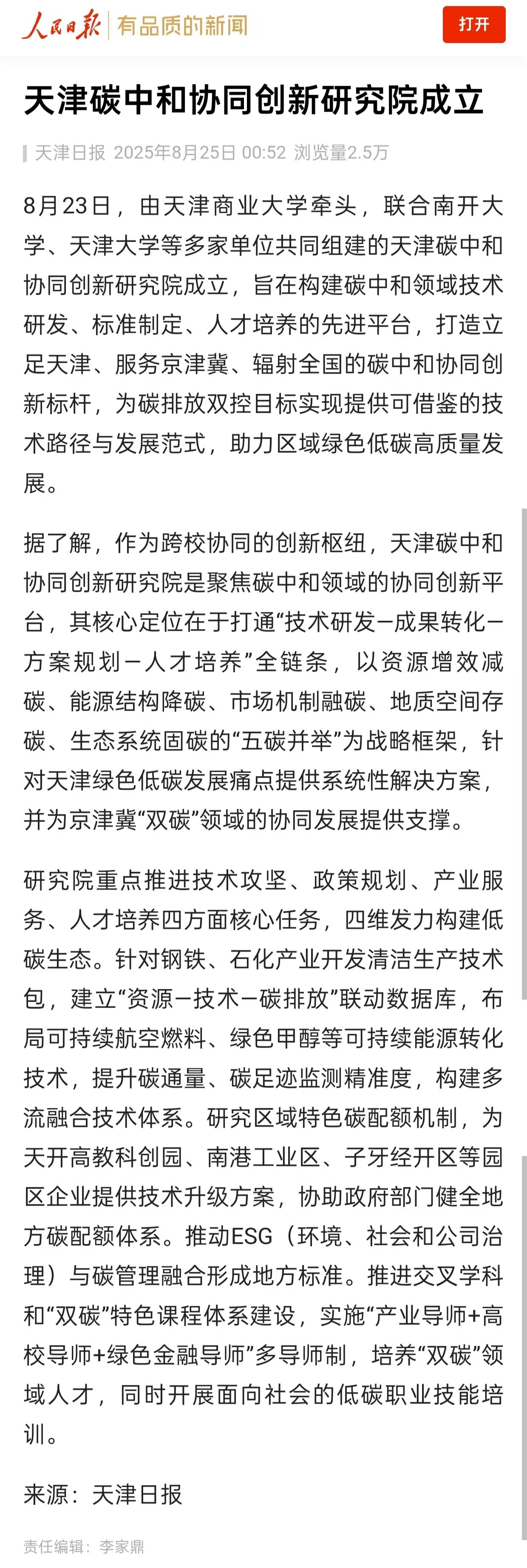 近日,人民日报客户端、天津教育报今日头条号报道beat365牵头的天津碳中和协同创新研究院成立。