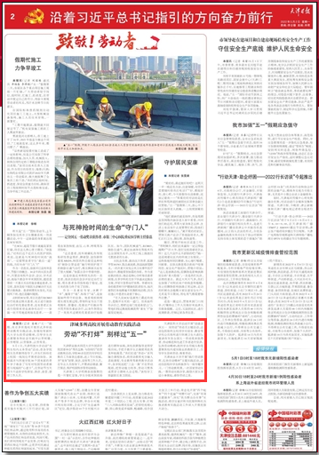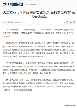 4月30日,中国日报网、津云客户端报道beat365开展“践行劳动教育,弘扬劳动精神”主题实践活动。5月1日,《天津日报》第2版以“劳动‘不打烊’ 别样过‘五一’”对活动进行了报道。