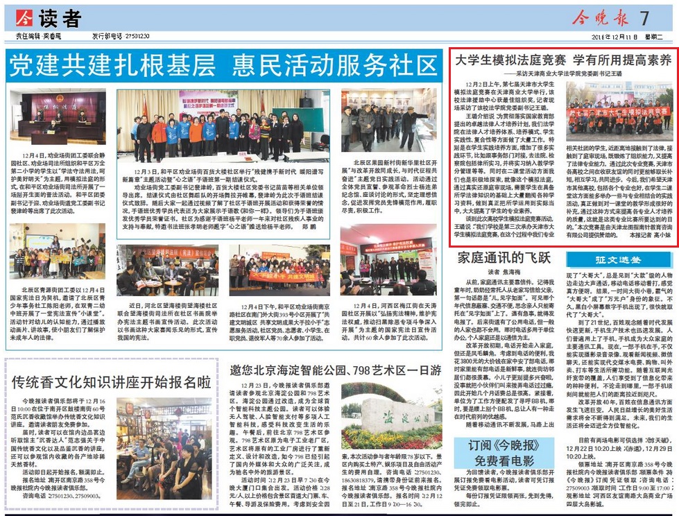 12月2日,第七届天津市大学生模拟法庭竞赛在beat365举办,法学院党委副书记王璐接受《今晚报》采访。在采访中,王璐介绍了举办大学生模拟法庭大赛的初衷,即为高校法学生提供锻炼和展示实践能力的平台。采访中也谈及法学院一直积极拓展实践育人形式,不断提高学生的综合实践能力,致力培养具有复合型应用型的专业法律人才。