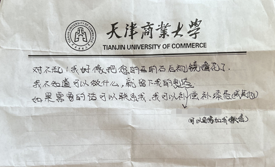 “我当时很慌,不知道该怎么办。”石同学说,自己赶紧停下查看,发现轿车的后视镜有一个白色的刮痕。她一下子不知道该怎么办,她想等着车主来了后,自己再当面解释。等了一段时间后,车主一直没有来。她便从书包里掏出纸和笔,在纸上留言:“对不起!我好像把您的车的右后视镜撞花了。我不知道可以做什么,就留下了我的电话,如果需要的话可以联系我,我可以补偿补漆费(或其他)……”