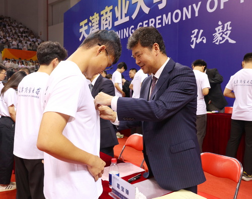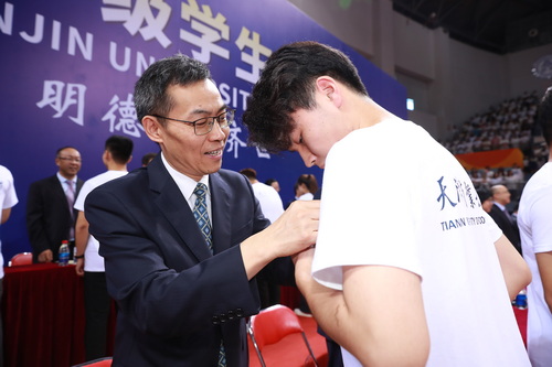 校党委副书记、校长葛宝臻为新生佩戴校徽