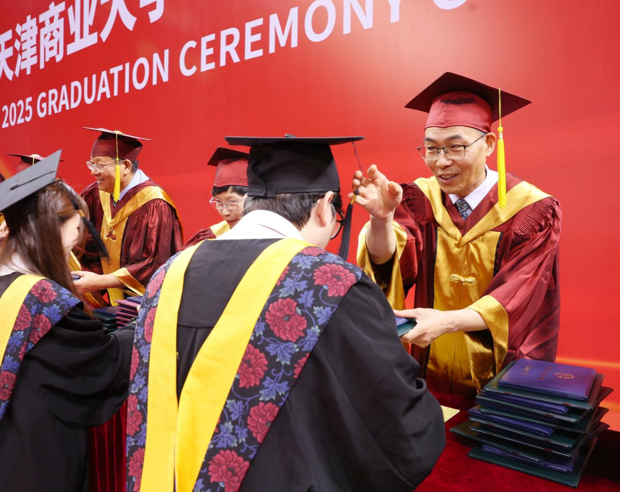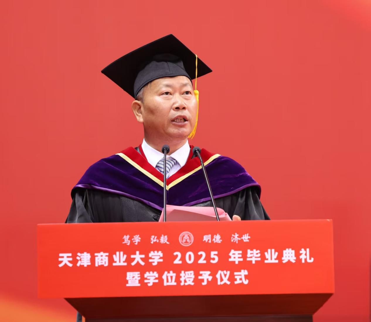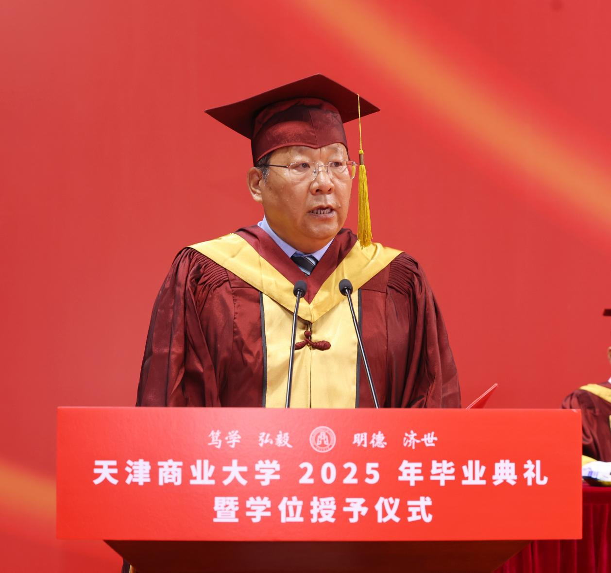 陈冠益对全体毕业生提出三点期许:一是明确人生目标,勇于奉献担当。要将爱国情、强国志、报国行自觉融入新时代的奋斗之中,将个人成长的“小我”融入国家发展战略的“大我”之中,勇担时代使命,在城市、在乡村、在基层、在每一个可以创造价值的地方,毫无保留地奉献青春与才干,在平凡的岗位上不断发光发热。二是练就过硬本领,持续增长才干。要敢于在艰苦环境中摸爬滚打,勇于在急难险重任务中接受考验,在经风雨、见世面中壮筋骨、长才干;要在毕业后继续丰富自身的知识结构,坚持不懈地进行前沿知识的更新迭代,求新知、守良知,用智慧把握并驾驭未来的人生航程。三是自信自立自强,保持积极心态。要时刻保持自立自强的人生态度,满怀信心迎接未来挑战,做心中有梦、脚下有路、坚韧不拔的天商人;要敢于直面困难,勇于接受挑战,正确看待成败得失,接纳真实的自我,保持身心健康,在工作、家庭、休闲等不同领域之间维系动态平衡,感受日常的美好与满足。他诚挚邀请大家常回家看看,为学校发展积极建言献策。