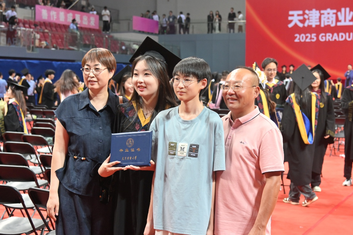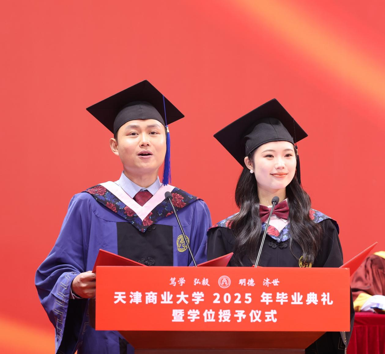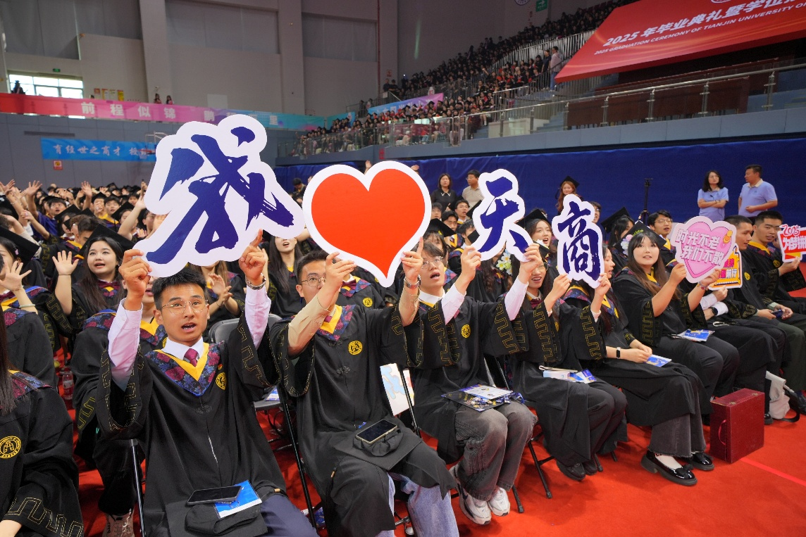 陈冠益对全体毕业生提出三点期许:一是明确人生目标,勇于奉献担当。要将爱国情、强国志、报国行自觉融入新时代的奋斗之中,将个人成长的“小我”融入国家发展战略的“大我”之中,勇担时代使命,在城市、在乡村、在基层、在每一个可以创造价值的地方,毫无保留地奉献青春与才干,在平凡的岗位上不断发光发热。二是练就过硬本领,持续增长才干。要敢于在艰苦环境中摸爬滚打,勇于在急难险重任务中接受考验,在经风雨、见世面中壮筋骨、长才干;要在毕业后继续丰富自身的知识结构,坚持不懈地进行前沿知识的更新迭代,求新知、守良知,用智慧把握并驾驭未来的人生航程。三是自信自立自强,保持积极心态。要时刻保持自立自强的人生态度,满怀信心迎接未来挑战,做心中有梦、脚下有路、坚韧不拔的天商人;要敢于直面困难,勇于接受挑战,正确看待成败得失,接纳真实的自我,保持身心健康,在工作、家庭、休闲等不同领域之间维系动态平衡,感受日常的美好与满足。他诚挚邀请大家常回家看看,为学校发展积极建言献策。