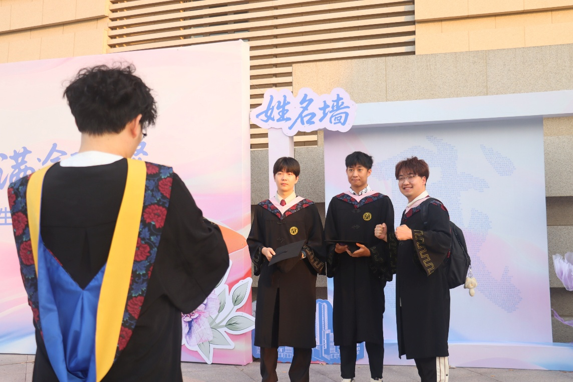 典礼开始前,学校以“毕业歌会”形式送别2025届毕业生,《昨日青空》《追梦赤子心》《骄傲的少年》等11首经典歌曲让现场气氛温馨感人。学校在校体育馆副馆专门开辟了家长观礼区,千余名家长到场共同见证这一重要而幸福的时刻。体育馆外精心设置了“毕业生姓名墙”“一路生花”等多个拍照打卡区,毕业生与家长们纷纷合影留念,留下了在天商校园的珍贵离别瞬间。