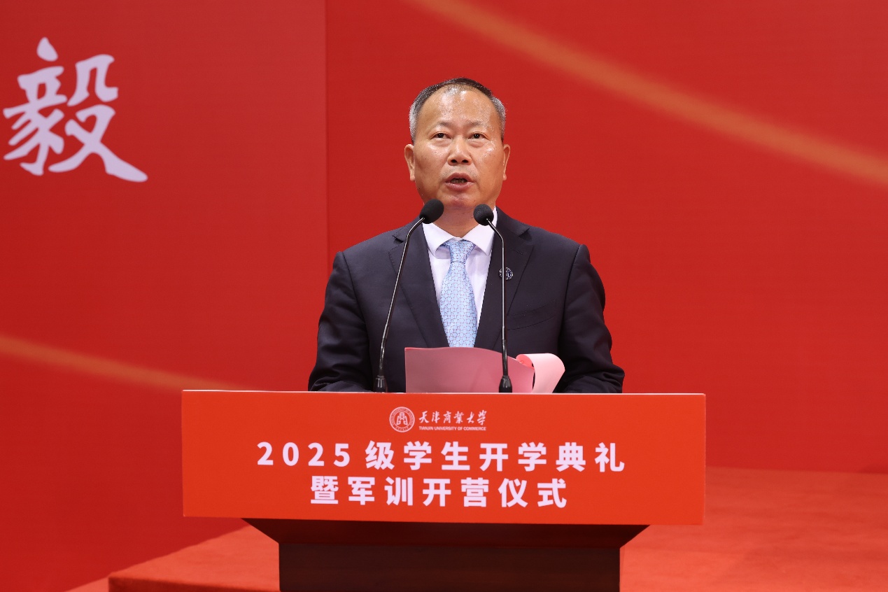 陈冠益在开学典礼上讲话并为全体新生讲授“开学第一课”。他在讲话中指出,45年来,天商始终致力于为党育人、为国育才,高质量推进特色鲜明高水平商业大学建设;致力于提升教育教学水平,增强办学实力;致力于改善育人环境,持续提升服务保障水平。他强调,今年是中国人民抗日战争暨世界反法西斯战争胜利80周年,作为新时代青年,要牢记习近平总书记嘱托,铭记历史、缅怀先烈、珍爱和平、开创未来。