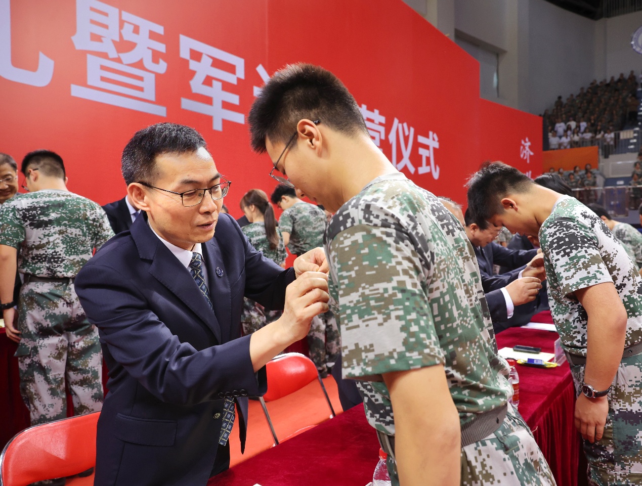 校党委副书记、校长陈冠益为新生佩戴校徽