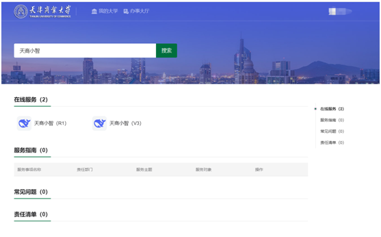 2.PC端访问:师生可登录学校“网上办事服务大厅”(ehall.tjcu.edu,cn),输入账号密码进入个人主页,检索“天商小智”,根据应用场景选择相应的应用,点击访问即可。