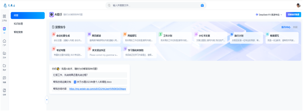 3.新升级的校园云盘“天商云”平台集成了强大的AI功能,基于DeepSeekR1、Kimi、豆包、文心一言等多种大模型的“AI助手”,可满足教师多业务场景应用需求,同时也可以将“天商云”上的内容创建个人专属知识库,满足个性化智能服务。