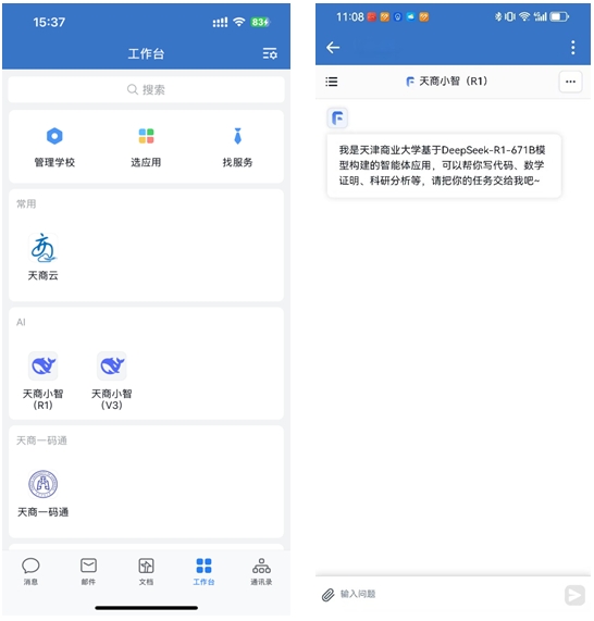 1.移动端访问:师生可登录企业微信,在“工作台”找到“天商小智(R1)”和“天商小智(V3)”,点击访问即可。