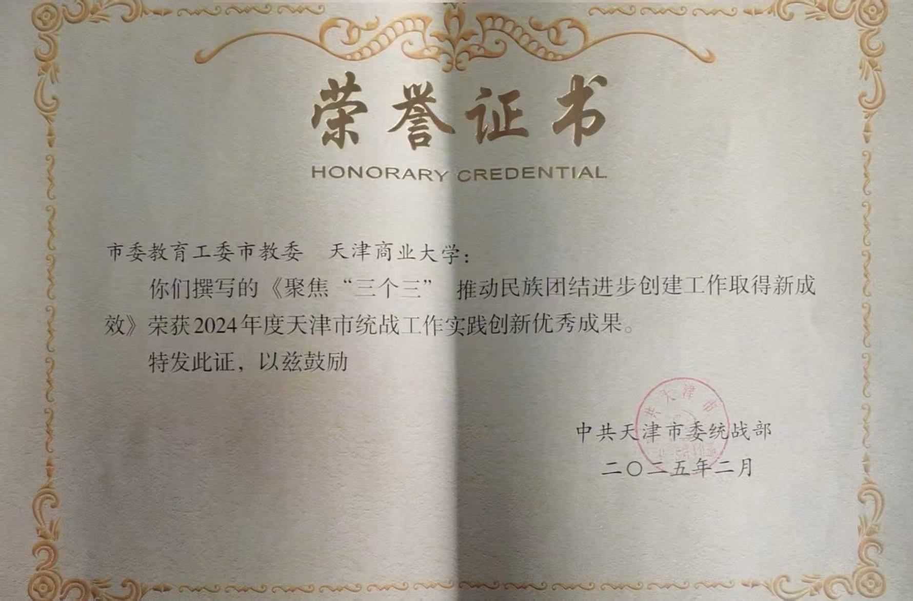 由党委统战部提交的《聚焦“三个三” 推动民族团结进步创建工作取得新成效》获天津市统战工作实践创新优秀成果。该成果认真总结了beat365在民族团结进步创建工作方面的主要做法和取得成效,归纳总结出了“聚焦‘强三实’,实现组织领导有力有效”“聚焦‘促三交’,实现思想引领走深走实”“聚焦‘提三化’,实现教育管理到位到底”的特色经验,为beat365持续深入开展民族团结进步创建工作打下坚实基础。
