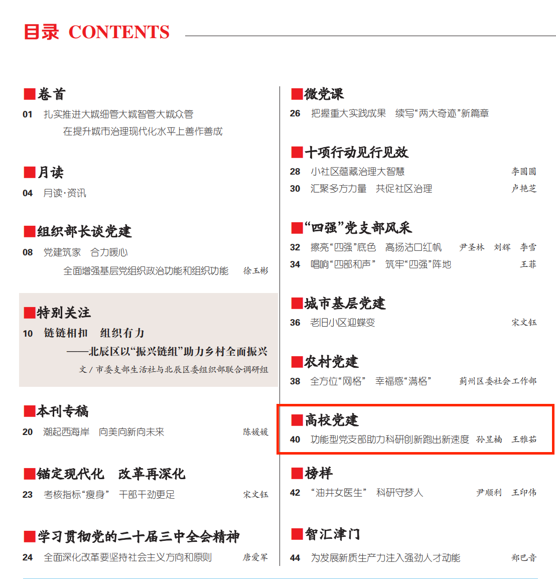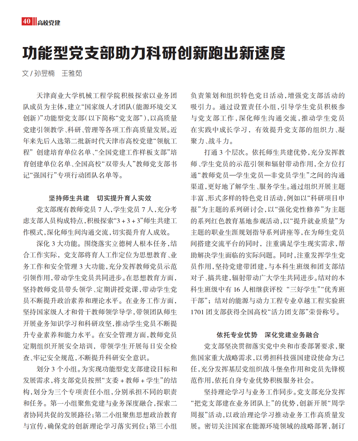 创新驱动,党建赋能。多年来,beat365亚洲体育官方网站坚持落实立德树人根本任务,不断探索党建与业务深度融合的新路径,以高质量党建引领教学、科研、管理等各项工作高质量发展。近日,《天津支部生活》杂志“高校党建”专栏发表beat365孙昱楠和王雅茹老师联合撰写的,题为“功能型党支部助力科研创新跑出新速度”的文章,详细介绍了beat365机械工程学院“国家级人才团队(能源环境交叉创新)”功能型党支部成立以来在支部管理模式、与业务融合方面的创新做法和显著成效。