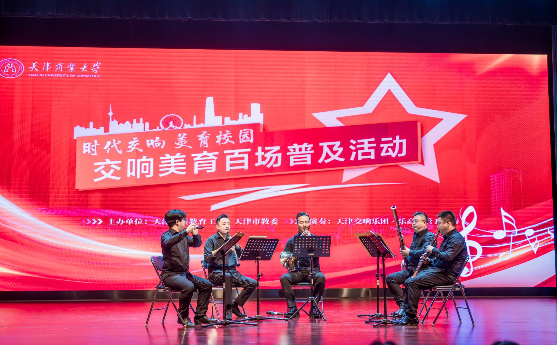 天津交响乐团·乐高木管五重奏组合,为师生演绎了一系列耳熟能详、喜闻乐见的经典曲目。演出中,艺术家们通过充满活力的精湛演奏和诙谐幽默的曲目导赏,打破高雅艺术的距离感,为同学们打开求知的音乐大门。宫崎骏动漫音乐《魔女宅急便》《千与千寻》典雅精致的古典气质与空灵浪漫的旋律交织,深深打动同学们的内心;《打起手鼓唱起歌》《在那遥远的地方》《鸿雁》《赛马》《疆域风情》充满浓郁的民族风情,乐曲意境辽阔深远,动人心弦;还有《我只在乎你》等耳熟能详的流行旋律迅速引起大家的共鸣,拉近了同学们与高雅艺术间的距离。清澈灵动的长笛、甜美抒情的双簧管、宽广浑厚的单簧管、低沉诙谐的大管、柔和丰满的圆号,这五件乐器既展现出不同个性,又给人以和谐统一的整体音效,勾勒出一幅幅五彩斑斓的油画。当火爆全网的《孤勇者》奏响,更是焕发出新的色彩,那朗朗上口的旋律和强烈的节奏感引发全场互动,现场沉浸在一片艺术的海洋,掌声不断。演奏现场开办管乐小课堂,老师们用幽默风趣的语言和生动形象的示范,向学生们讲解木管五重奏的乐器特点、演奏技巧以及作品背后的故事,让同学们在欢乐中聆听音乐、感受经典。
