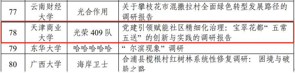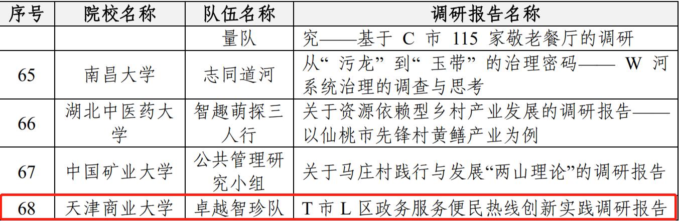 同时,本届大赛首次增设了调研报告奖。郭璐璐、潘金典、赵梦雅、胡啸赫四位同学共同撰写的《T市L区政务服务便民热线创新实践调研报告》(指导教师:赵伯艳)获得调研报告二等奖。王俊博、王新宇、纪学智、刘超、孙源五位同学共同撰写的调研报告《党建引领赋能社区精细化治理:宝翠花都“五常五送”的创新与实践的调研报告》(指导教师:秦勤、李新刚),获得调研报告三等奖。