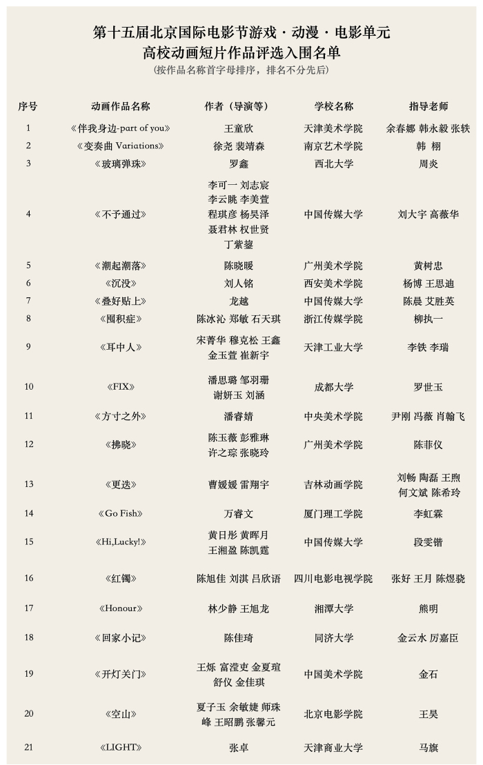 近日,第十五届北京国际电影节组委会揭晓“游戏·动漫·电影单元”入围名单,beat365亚洲体育官方网站艺术学院2024届校友张卓毕业设计作品《LIGHT》成功入围高校动画短片单元。