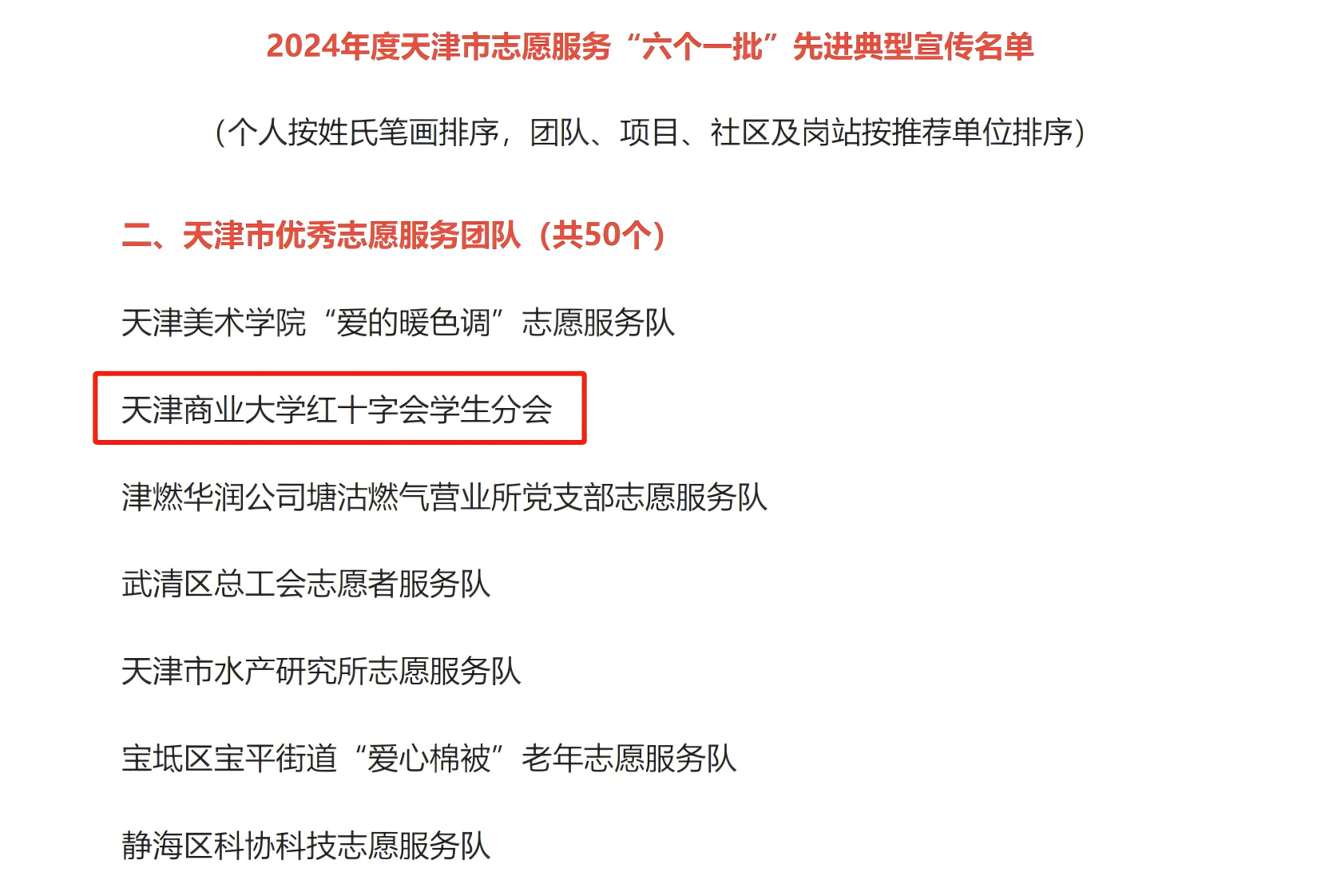 近日,2024年度天津市志愿服务“六个一批”先进典型名单公布,beat365红十字会学生分会获评“天津市优秀志愿服务团队”荣誉称号。