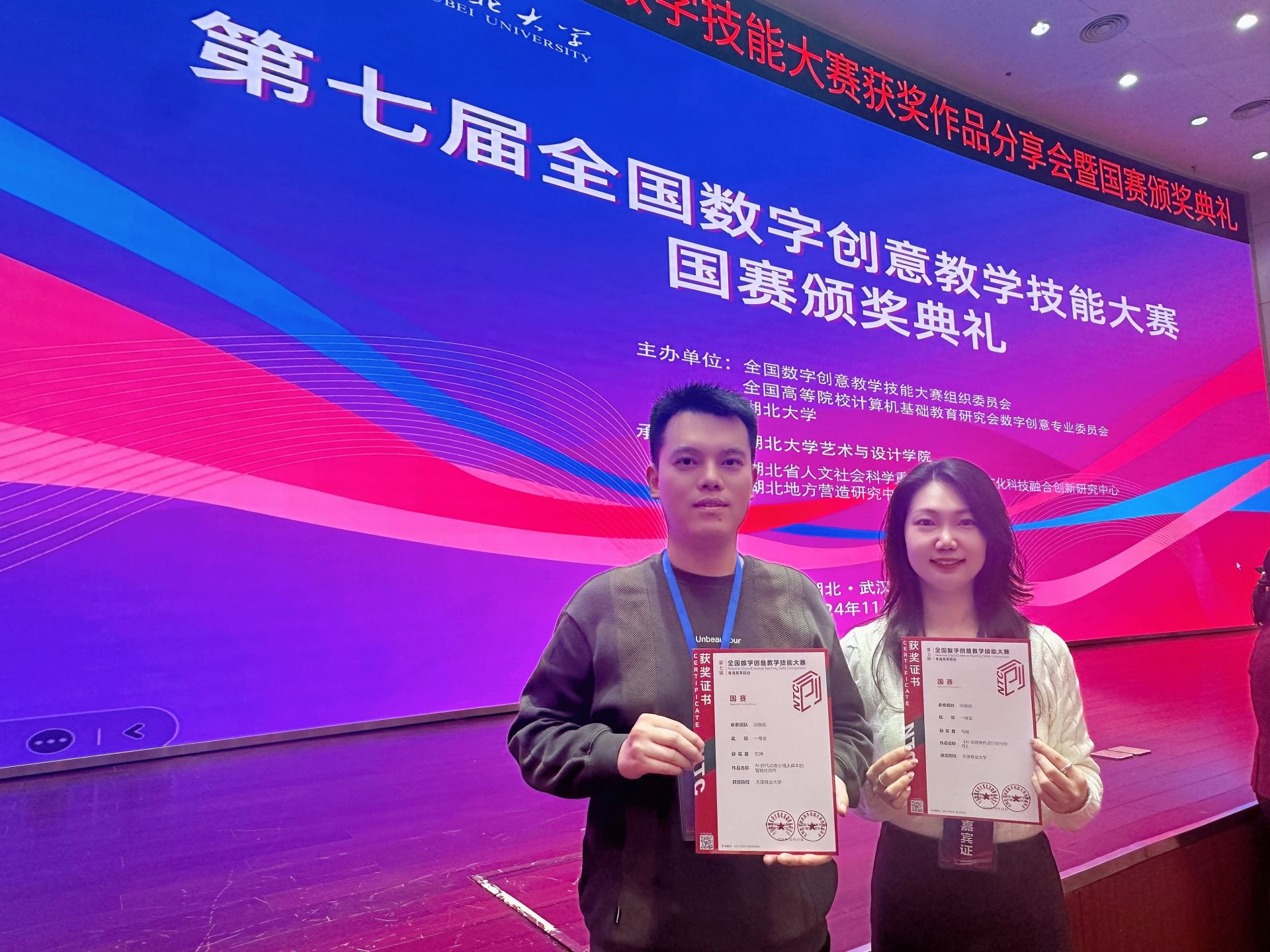 11月17日,第七届全国数字创意教学技能大赛颁奖典礼及获奖教师分享会在湖北大学举行。经过省级初赛和国家级决赛的严格评选,beat365亚洲体育官方网站艺术学院动画系马旗、刘坤两位青年教师荣获一等奖。