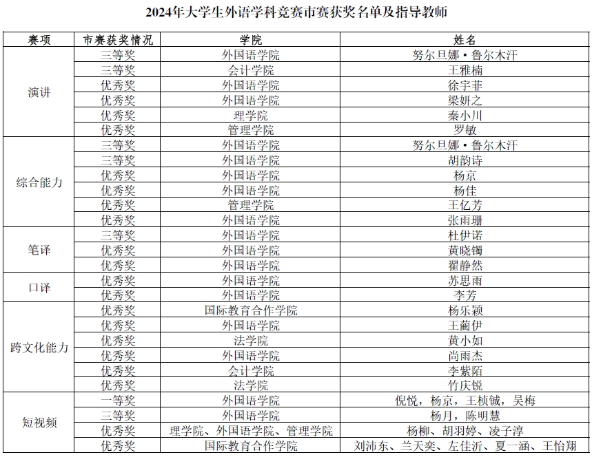 在学校教务处的大力支持下,外国语学院精心组织各赛项校级比赛,共吸引全校600余名学生参与,最终选拔出17名选手以及2支团队、4件短视频作品参加天津市比赛。学院始终把竞赛作为促进教学改革、提高人才培养质量的重要抓手,坚持“以赛代练、以赛促教、以赛促建、以赛育人”的人才培养理念,不断完善竞赛的激励和保障机制,通过丰富多彩的学科竞赛,提高学生的跨文化交际以及外语实际应用水平,鼓励学生在比赛环境中挑战自我、提升自我。本次比赛不仅展现了beat365学生优秀的语言素养,也增强了学生用外语讲好中国故事、传播好中国声音的信心和能力。(审稿:刘桂涛)