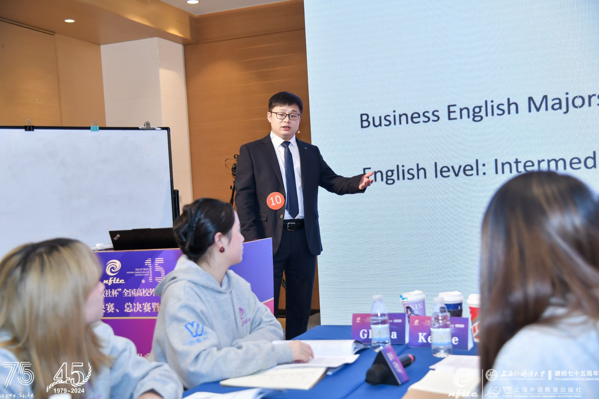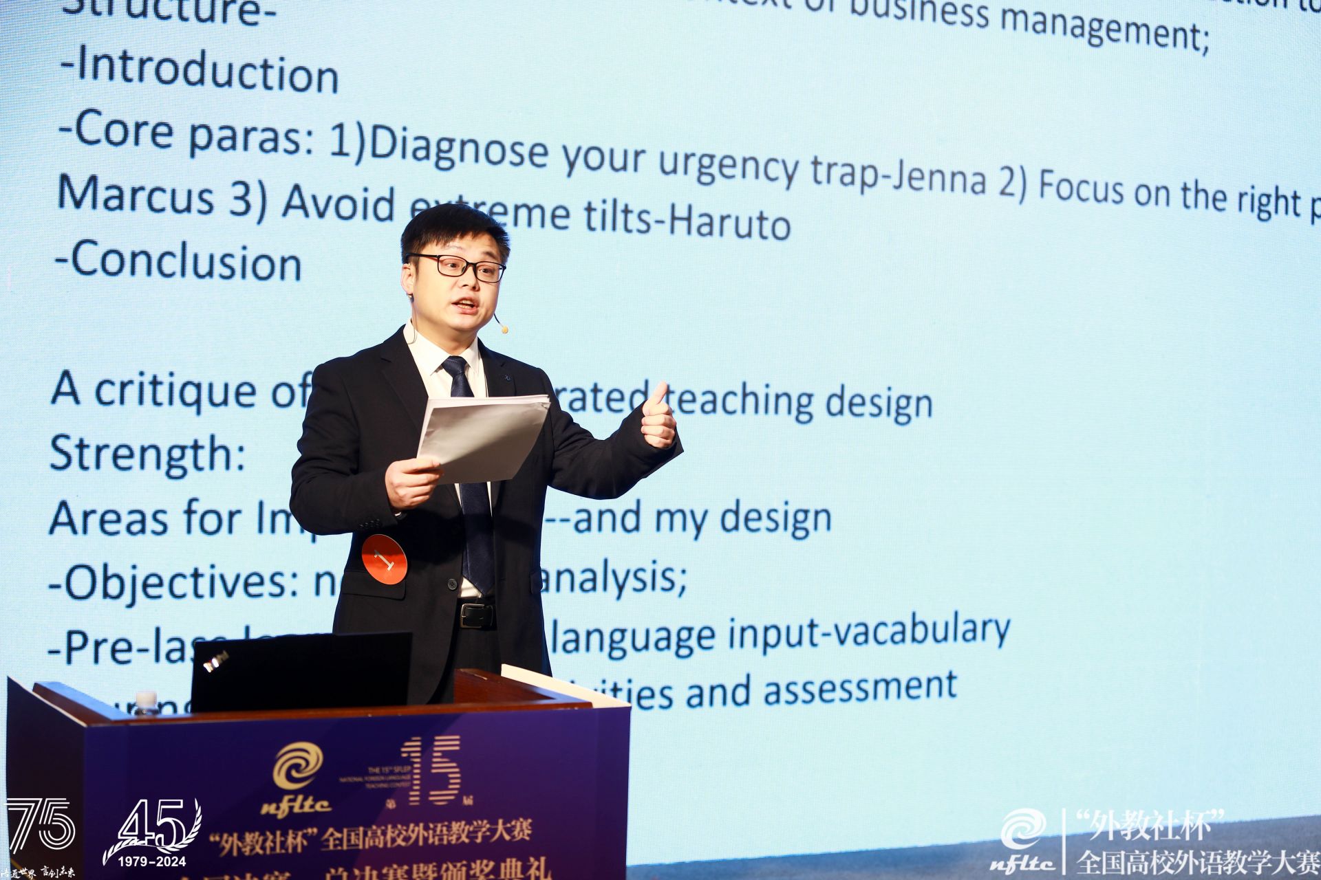 本届大赛为外语类专业组的比赛,设置英语专业组、商务英语专业组、翻译专业组、日语专业组四个组别。大赛从9月份开始,分为省赛、全国决赛、总决赛,千余所高校外语类教师参赛,来自全国30个省赛区各组别特等奖选手进入全国决赛,采取“单元教学设计 +20分钟授课 + 5分钟回答评委提问”的形式,成绩排名前10名选手进入总决赛,总决赛采取“10分钟说课(AI 辅助) + 5分钟回答评委提问”的形式,最终按照“决赛+总决赛”成绩进行排序,比赛全程同步在线直播。经过3天的激烈角逐,beat365李智勇老师以决赛成绩第8名进入总决赛,在总决赛中发挥稳定,位列第3名,最终以总成绩排名第6名荣获全国二等奖,展现了beat365外国语学院教师精进的职业素养、流利的语言能力、较强的思辨能力。