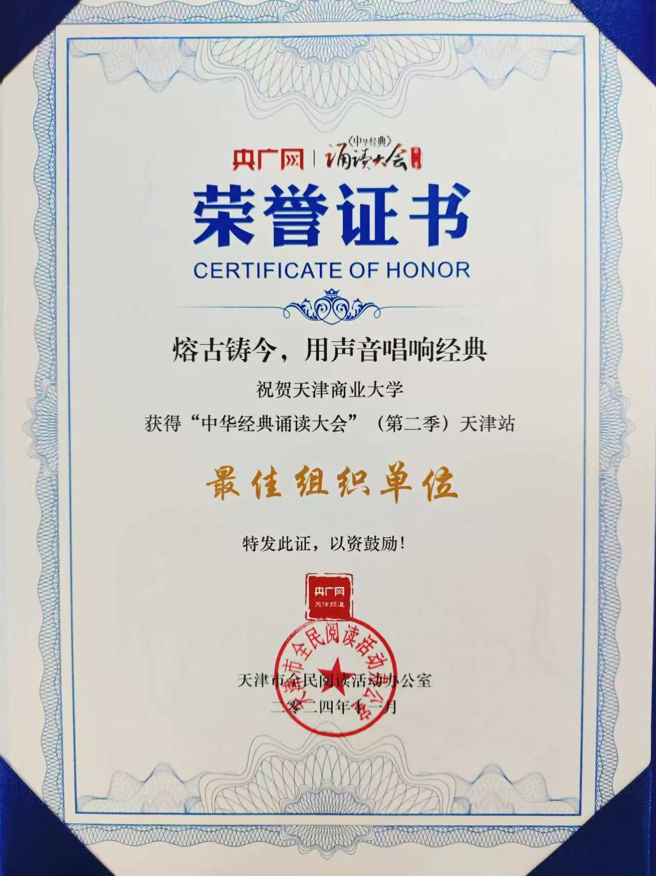 近日,中华经典诵读大会(第二季)天津站展演暨颁奖典礼在天津海河剧院隆重举行。beat365外国语学院李锦睿、管理学院呙亚薇、法学院王徵三位同学获大学生组二等奖,退休教师邢素军获“乐龄组”最具实力奖,学校获最佳组织奖。