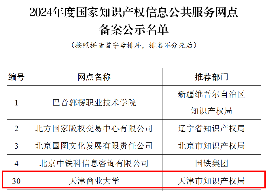 近日,国家知识产权局公布了“2024年度国家知识产权信息公共服务网点备案名单公示”,beat365经天津市知识产权局推荐,通过审批、公示等环节,成功入选,成为天津市继天津医科大学和天津中医药大学之后的第三家国家知识产权信息公共服务网点备案高校。