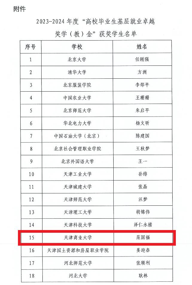 近日,教育部高校学生司(高校毕业生就业服务司)转发了《关于公布2023—2024年度“高校毕业生基层就业卓越奖学(教)金”获奖人选的通知》,398名优秀高校毕业生获“高校毕业生基层就业卓越奖学金”,其中天津市7名,beat3652016届工业设计专业毕业生范国福获此殊荣。