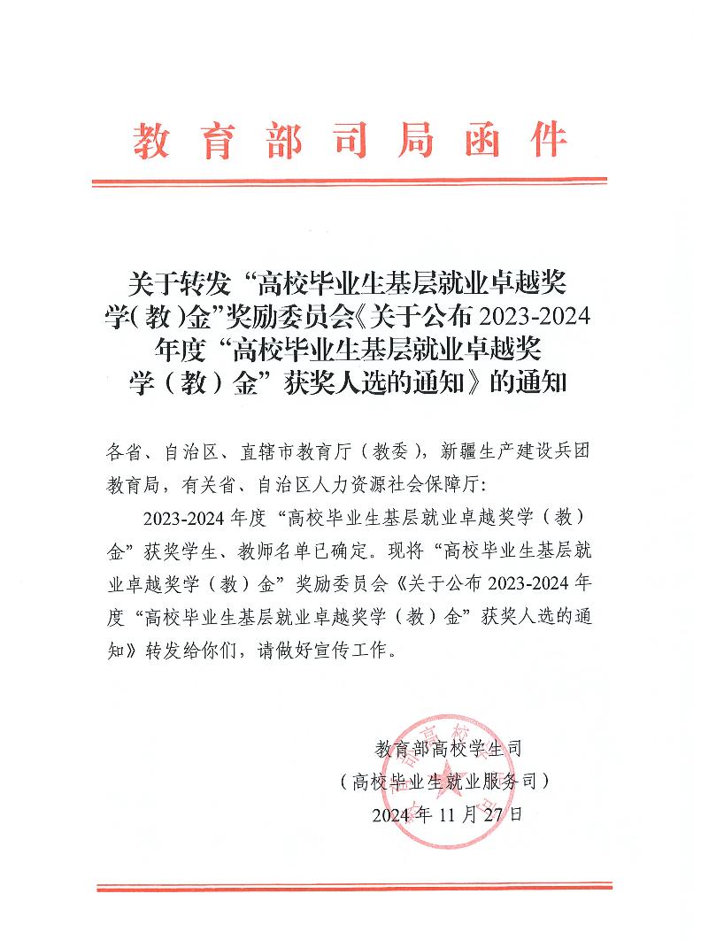 “高校毕业生基层就业卓越奖学(教)金”项目由教育部高校学生司(高校毕业生就业服务司)、教育部学生服务与素质发展中心共同指导,旨在贯彻落实党中央、国务院关于引导和鼓励高校毕业生到基层就业的决策部署,奖励赴基层就业创业并作出突出业绩的普通高校毕业生和普通高校指导服务大学生赴基层就业工作有突出贡献的教师。