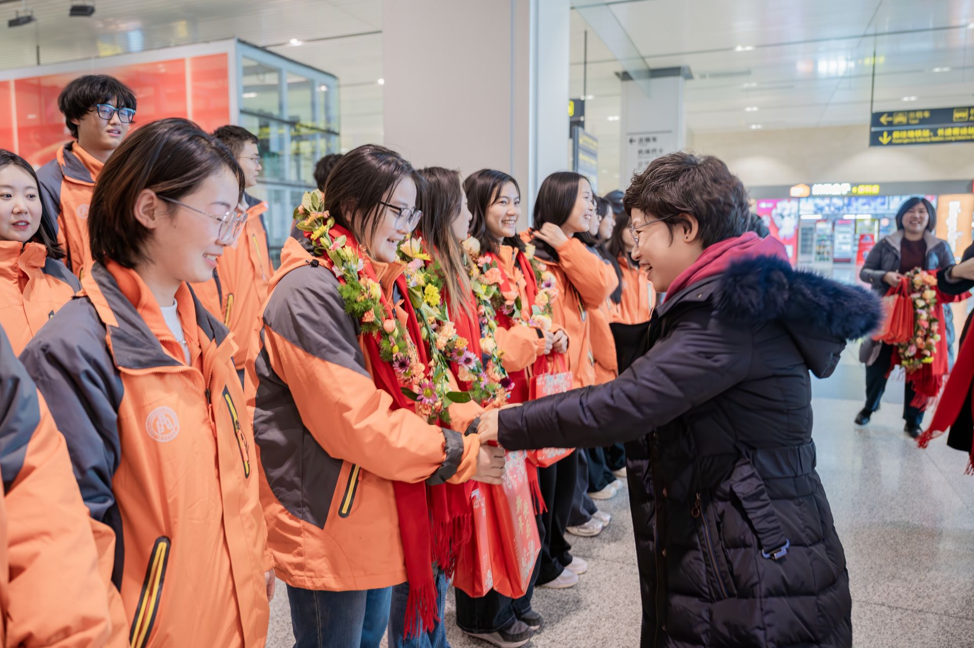 暖心的迎接现场让支教团师生感受到了冬日返程后的第一份温暖。带队教师张玉萌走出机场大厅,被眼前的欢迎横幅、关心的问候和热烈的掌声所感动,“感谢学校领导和老师深夜前来迎接我们,精心准备的暖心接机瞬间驱散了我们3700多公里跋涉的疲惫,我们一定将援疆支教实践经验融入日常学生思想政治教育,引导更多的学生铸牢中华民族共同体意识,让青春之花绽放在祖国最需要的地方。”支教团成员、机械工程学院陈薪宇感慨道,“三个半月时光如白驹过隙,我们在援疆支教中实现了从大学生到教师的蜕变,这段经历不仅带来多维度的成长与自我突破,更让我们意识到了沉甸甸的社会责任感与担当,这是一段难忘的历程,更是人生路上熠熠生辉的财富,为今后的学习生活提供源源不断的精神动力,激励我们在未来的求学路上笃定前行。”
