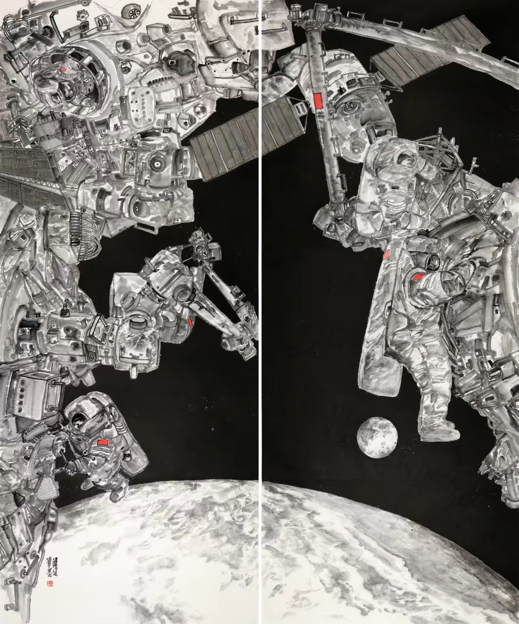 《逐梦寰宇》用富有想象力的创作手法,运用中国画纯水墨艺术形式,演绎中国航天精彩传奇,彰显中国载人航天事业的发展,表达了对祖国航天事业的憧憬与祝福,构筑了立志探索浩瀚宇宙的伟大“航天梦”。《逐梦寰宇》的完成,为现实题材美术创作积累了经验,也为今后大型航天题材美术创作积累了宝贵素材。