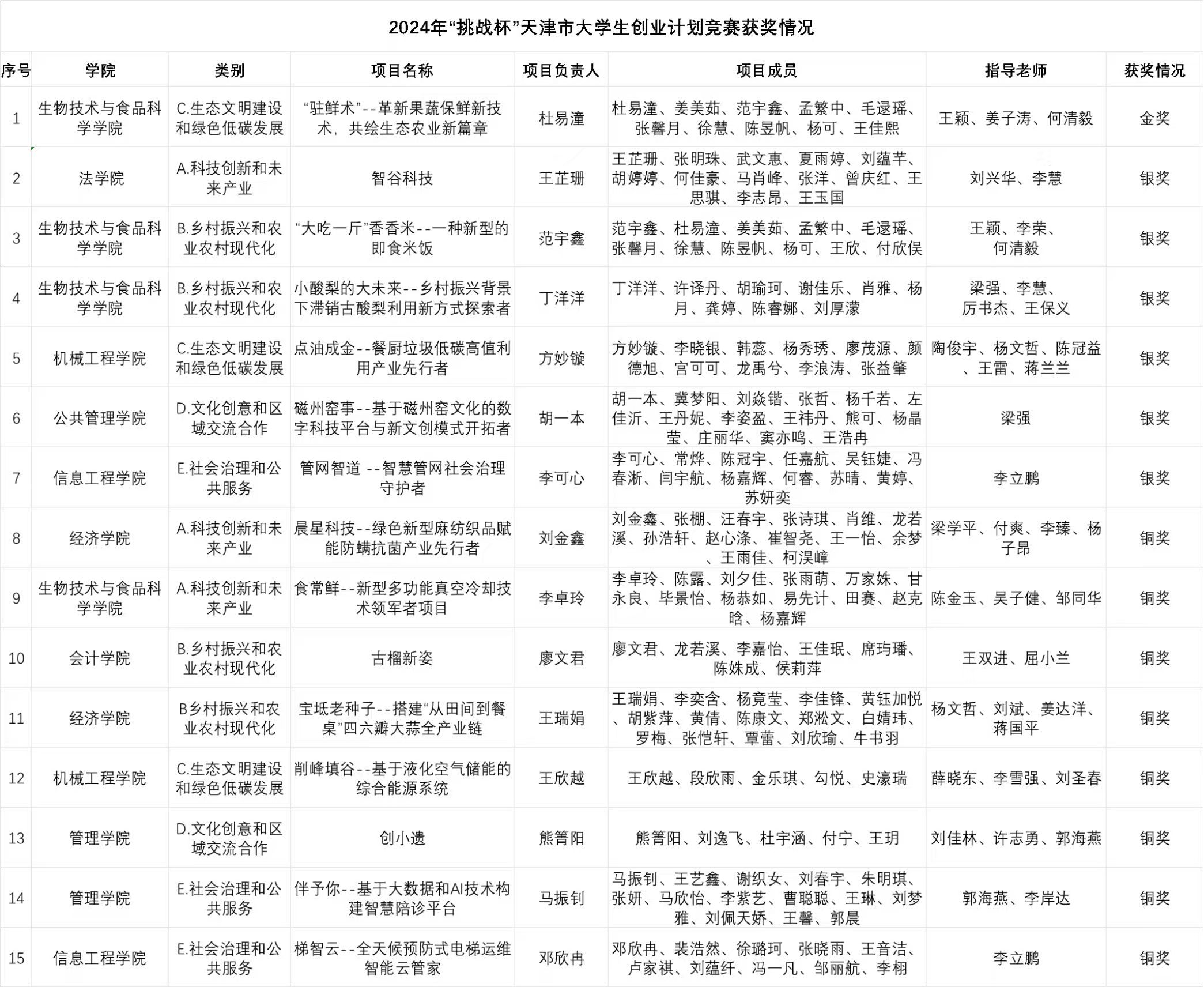 近日,由团市委、市委教育工委、市教委、市科技局、市人社局、市科协、市学联联合主办的2024年“挑战杯”天津市大学生创业计划竞赛获奖作品名单公布。beat365遴选推荐参加市级竞赛的15项作品均获奖,其中,金奖1项、银奖6项、铜奖8项。《驻鲜术——革新果蔬保鲜技术,共绘乡村振兴新篇章》《古梨新香——古酸梨滞销背景下乡村振兴新模式的引领者》两项作品被推荐参加国赛。校团委获优秀组织奖。