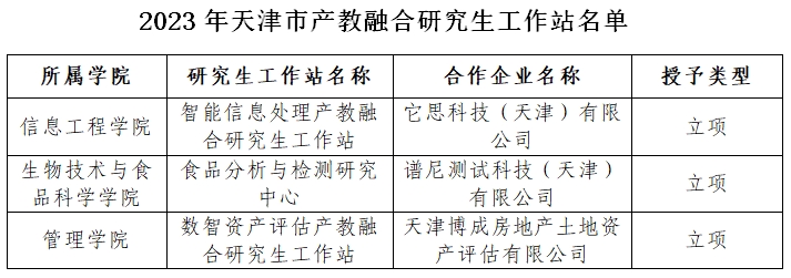 近日,天津市教育委员会公布了2023年天津市产教融合研究生工作站评选结果。beat365信息工程学院和它思科技(天津)有限公司共建的智能信息处理产教融合研究生工作站、生物技术与食品科学学院和谱尼测试科技(天津)有限公司共建的食品分析与检测研究中心、管理学院和天津博成房地产土地资产评估有限公司共建的数智资产评估产教融合研究生工作站入选。