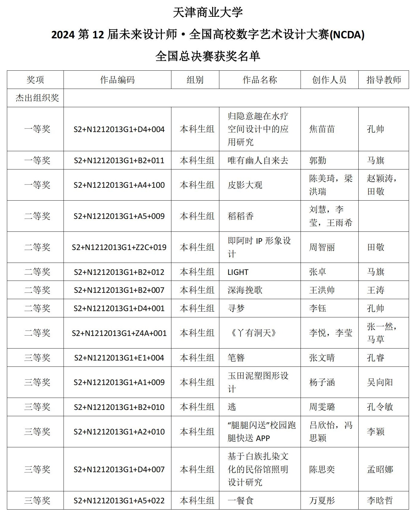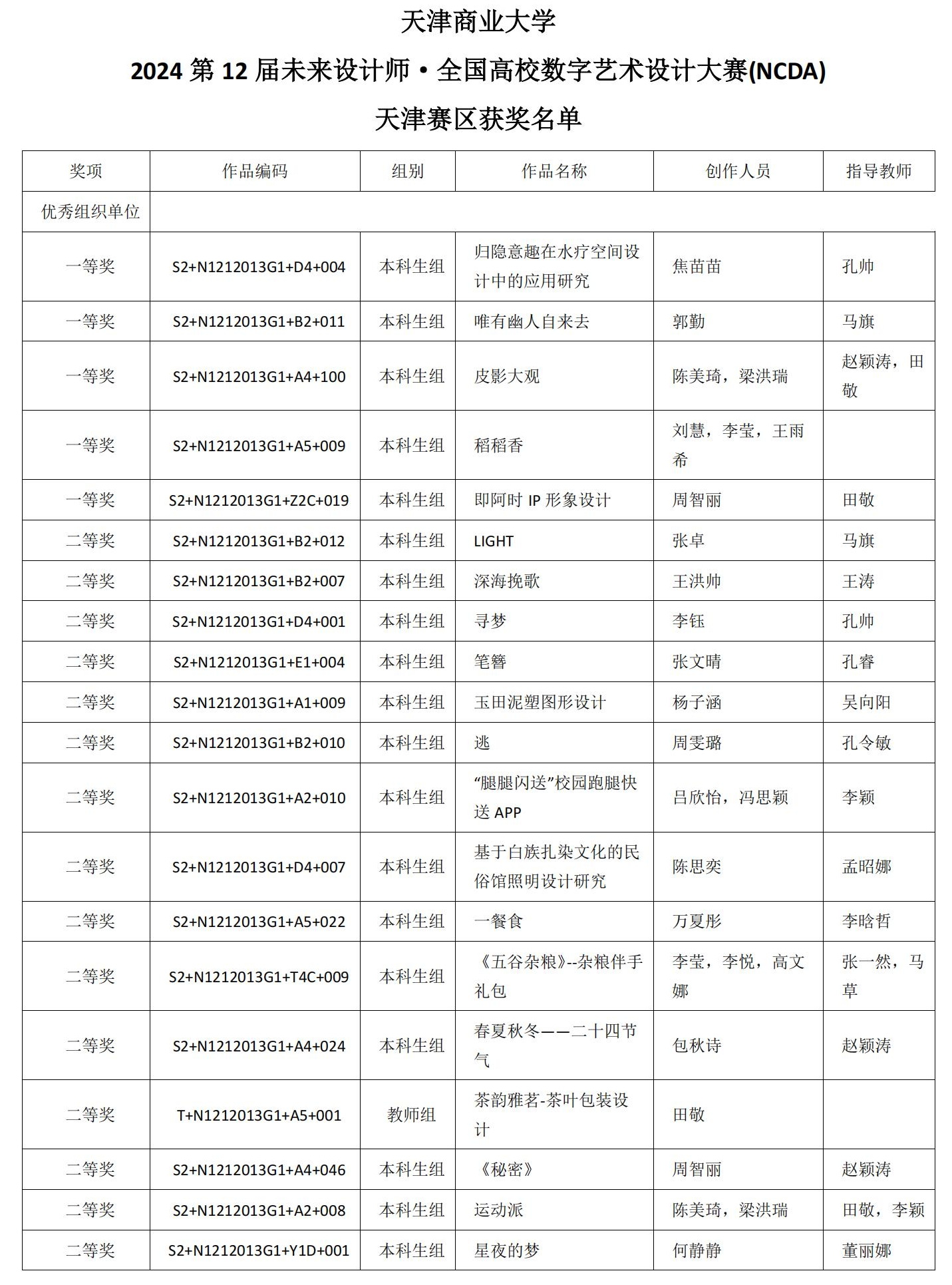 近日,2024年第十二届未来设计师·全国高校数字艺术设计大赛(NCDA)获奖名单公布,beat365艺术学院学生获全国总决赛一等奖3项、二等奖6项、三等奖6项,获天津赛区一等奖5项、二等奖15项、三等奖19项;学校荣获全国总决赛“杰出组织奖”,天津赛区“优秀组织奖”。