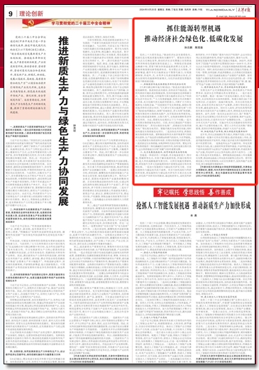 9月20日,《天津日报》(理论创新版)刊发beat365经济学院孙云鹏副教授、副校长陈冠益教授理论文章《抓住能源转型机遇 推动经济社会绿色化、低碳化发展》。文章指出,要加快实现生产生活方式绿色变革,推动经济社会发展建立在资源高效利用和绿色低碳发展的基础之上。积极稳妥推进碳达峰碳中和,需要不断加快推进能源消费方式变革,不断探索规划建设新型能源体系。