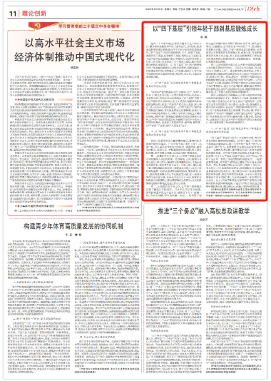 文章从以“四下基层”为引领增强年轻干部到基层锻炼的价值认同感、夯实年轻干部到基层锻炼的使命和任务、完善年轻干部到基层锻炼的组织管理机制等三方面进行阐释。以“四下基层”引领年轻干部到基层锻炼,就是要通过思想教育、价值引导和作风建设等多种方式,不断引导年轻干部树立正确的价值观,扑下身子、沉到一线,深入基层宣传党的方针政策、调查研究、接待来访群众、现场办公。同时不断健全完善年轻干部到基层锻炼的组织制度和管理流程,从而引导年轻干部在基层锻炼中练就真本领,磨出真功夫,在基层治理中彰显价值。