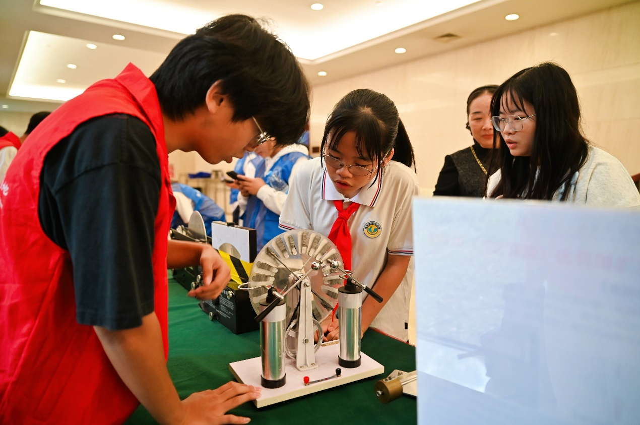 科普研讨会环节,来自多所学校的专家学者就科普资源开发、科普项目申报、科普课程建设以及科普活动组织等相关主题进行汇报交流。在科普资源展示中,来自天津中德应用技术大学物理创新与应用科普基地、天津城建大学物理科学与创新实践科普基地、河北工业大学物理科普基地、天津理工大学物理科普基地的师生展示了“磁力增速器”“离子推进器”“蜗牛球”等丰富多彩的科普产品,吸引了与会人员积极参与互动,亲身体验科学的魅力。