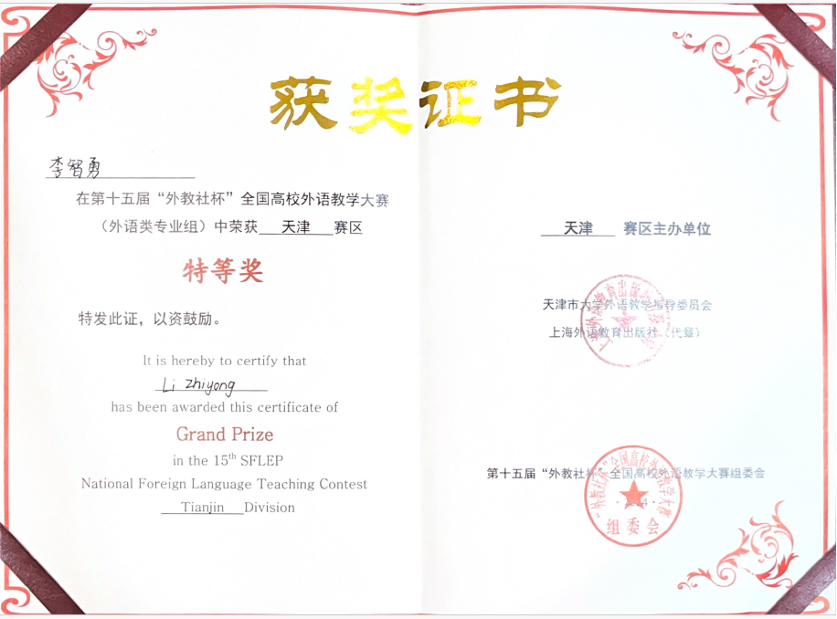 9月28日,第十五届“外教社杯”全国高校外语教学大赛(外语类专业组)天津赛区比赛在天津财经大学举行。beat365外国语学院英语系李智勇老师凭借其出色的教学能力和专业素养,在众多参赛选手中脱颖而出,荣获天津赛区特等奖,并将代表天津参加今年12月在上海举行的全国比赛。
