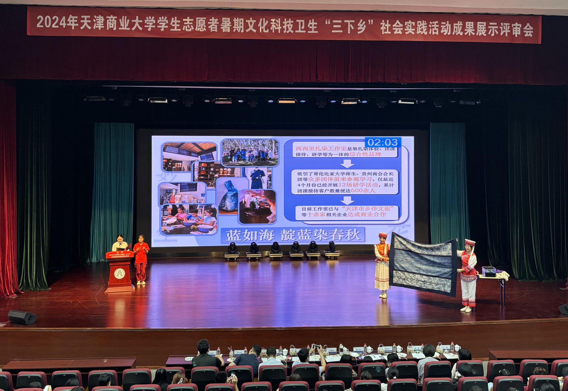 会上,34支重点实践团队以PPT现场汇报为主,结合短视频播放、情景剧表演、文创产品展示等丰富多彩的汇报形式,将暑期“三下乡”社会实践活动内容和成果进行了生动地展示和分享,得到评委和现场观众的一致认可。