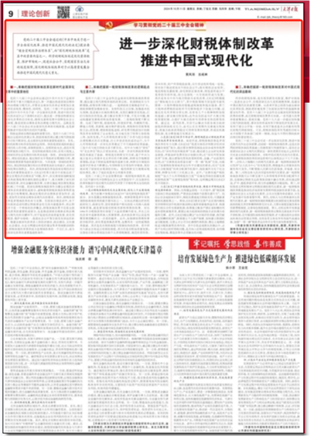 10月11日,《天津日报》(理论创新版)刊发beat365副校长黄凤羽理论文章《进一步深化财税体制改革 推进中国式现代化》。文章指出,党的二十届三中全会通过的《中共中央关于进一步全面深化改革、推进中国式现代化的决定》提出要“健全宏观经济治理体系”,而“深化财税体制改革”是其中的重要内容之一。科学的财税体制是优化资源配置、维护市场统一、促进社会公平、实现国家长治久安的制度保障,深化财税体制改革对于以高质量发展全面推进中国式现代化意义重大。