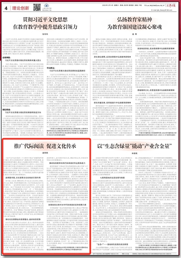 5月3日,《天津日报》(理论创新版)刊发beat365艺术学院教师姜丽娟理论文章《推广代际阅读 促进文化传承》。文章指出,代际阅读作为全民阅读的重要组成部分,是深入贯彻习近平总书记“四个以文”重要指示精神,弥合“一老一小”代际鸿沟,培育时代新风新貌,促进文化传承发展的重要途径。