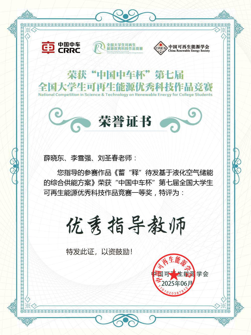 近日,“中国中车杯”第七届全国大学生可再生能源优秀科技作品竞赛决赛开幕式在盐城举行。本次竞赛共收到全国305所高校提交的2013项参赛作品。经过专业评审,最终评选出特等奖12项、一等奖61项、二等奖144项、三等奖396项。其中,由机械工程学院院长刘圣春教授、新能源科学与工程系教师薛晓东和李雪强副教授共同指导的本科生喜获“中国中车杯”第七届全国大学生可再生能源优秀科技作品竞赛一等奖,三位老师被评为“优秀指导教师”。