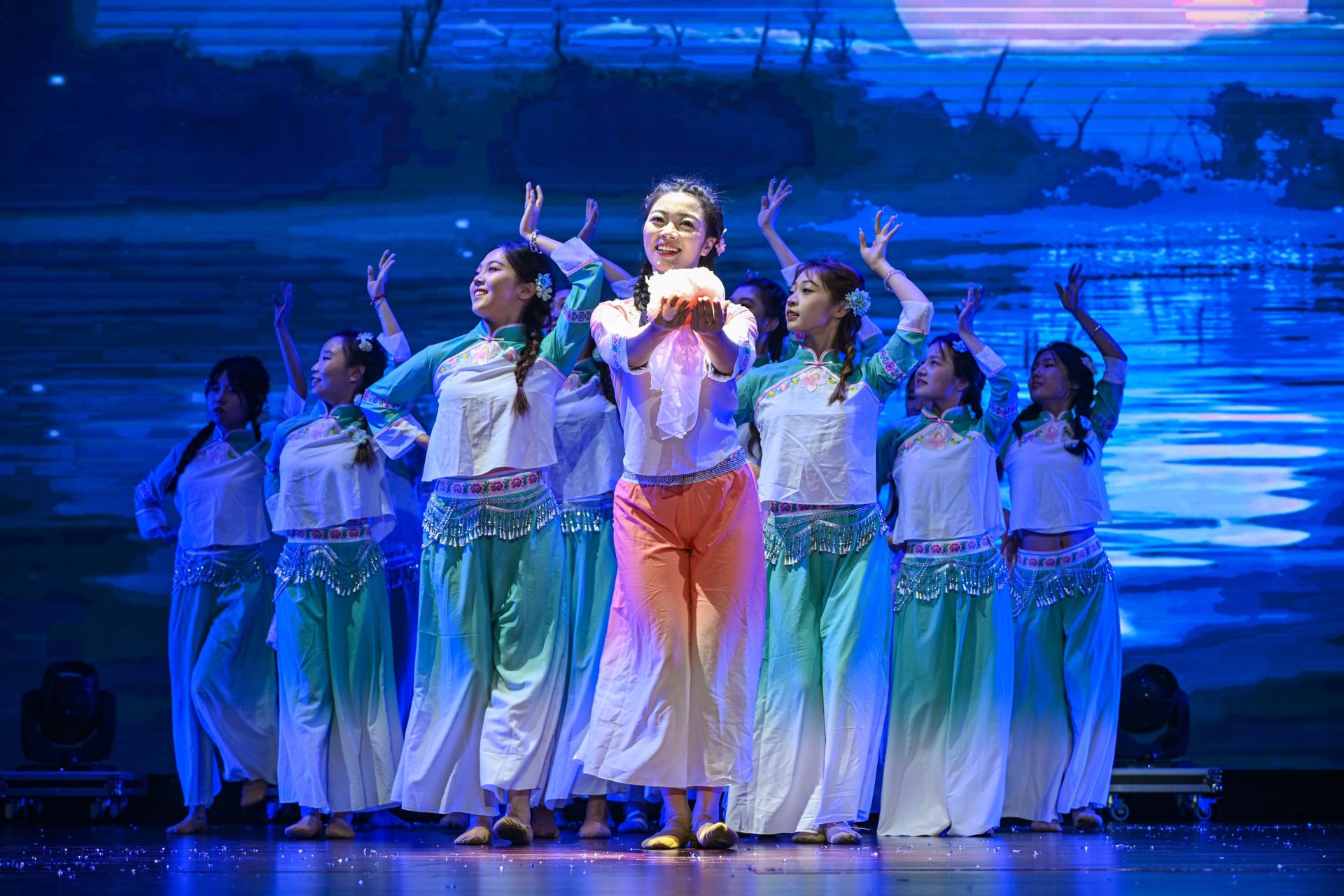 第二篇章“绽芳华·青春天商”:星海Glee无伴奏人声带来的歌曲《稻香》温暖治愈,以纯净人声带领同学重温校园时光的宁静;歌曲《我还年轻我还年轻》、舞蹈《楼外楼》彰显天商青年锐气,点燃全场沸腾气氛;歌曲《Stitches》,歌声美妙动听,令人陶醉,歌曲《乌兰巴托的夜》那空灵飘渺的歌声犹如天籁美妙动听,歌曲《天空》唱出了无尽的故事,直击心灵;舞蹈《朝花》循着时光旋律,穿越榕树斑驳光影,别具韵味,动作唯美,为大家带来美的盛宴;魔术《英仙座》互动感十足,给大家带来接连不断的惊喜。