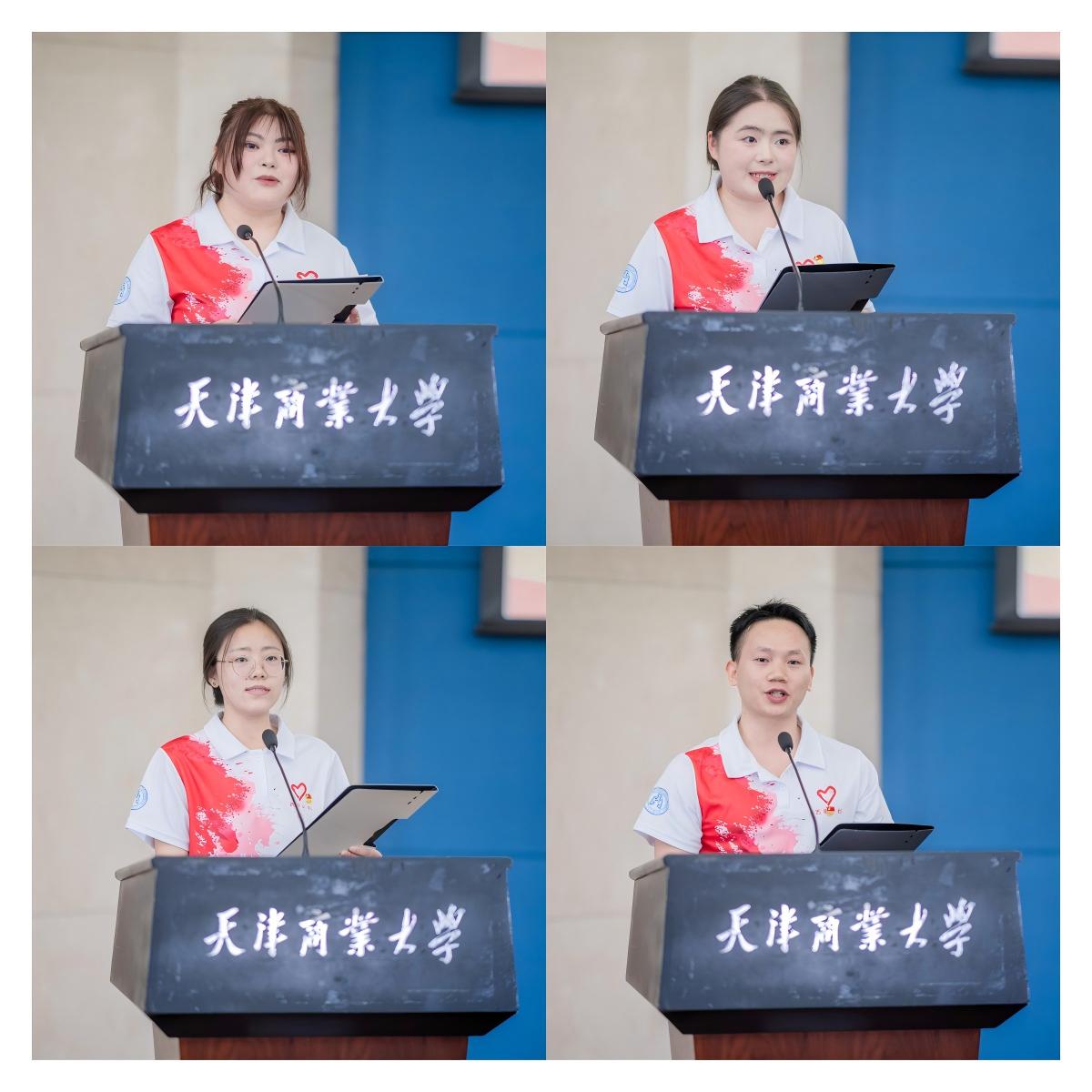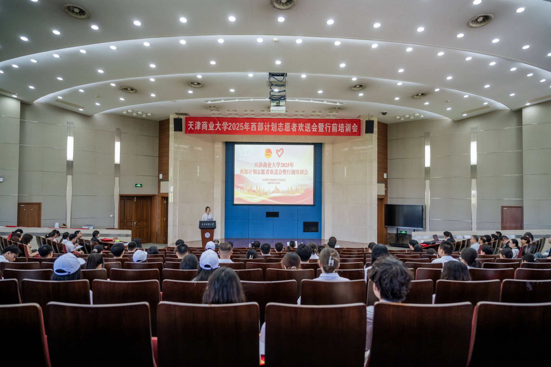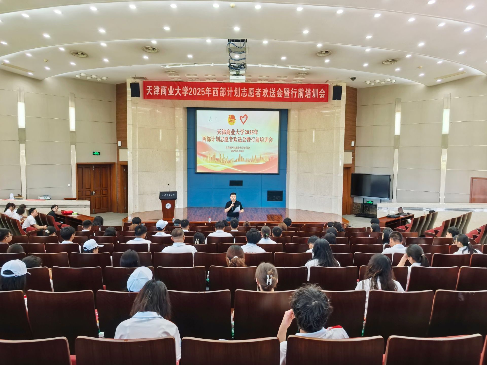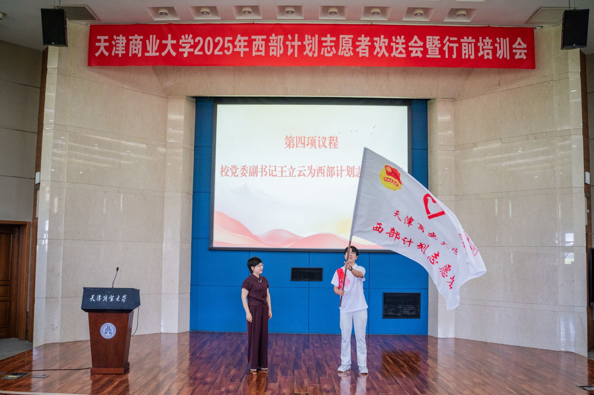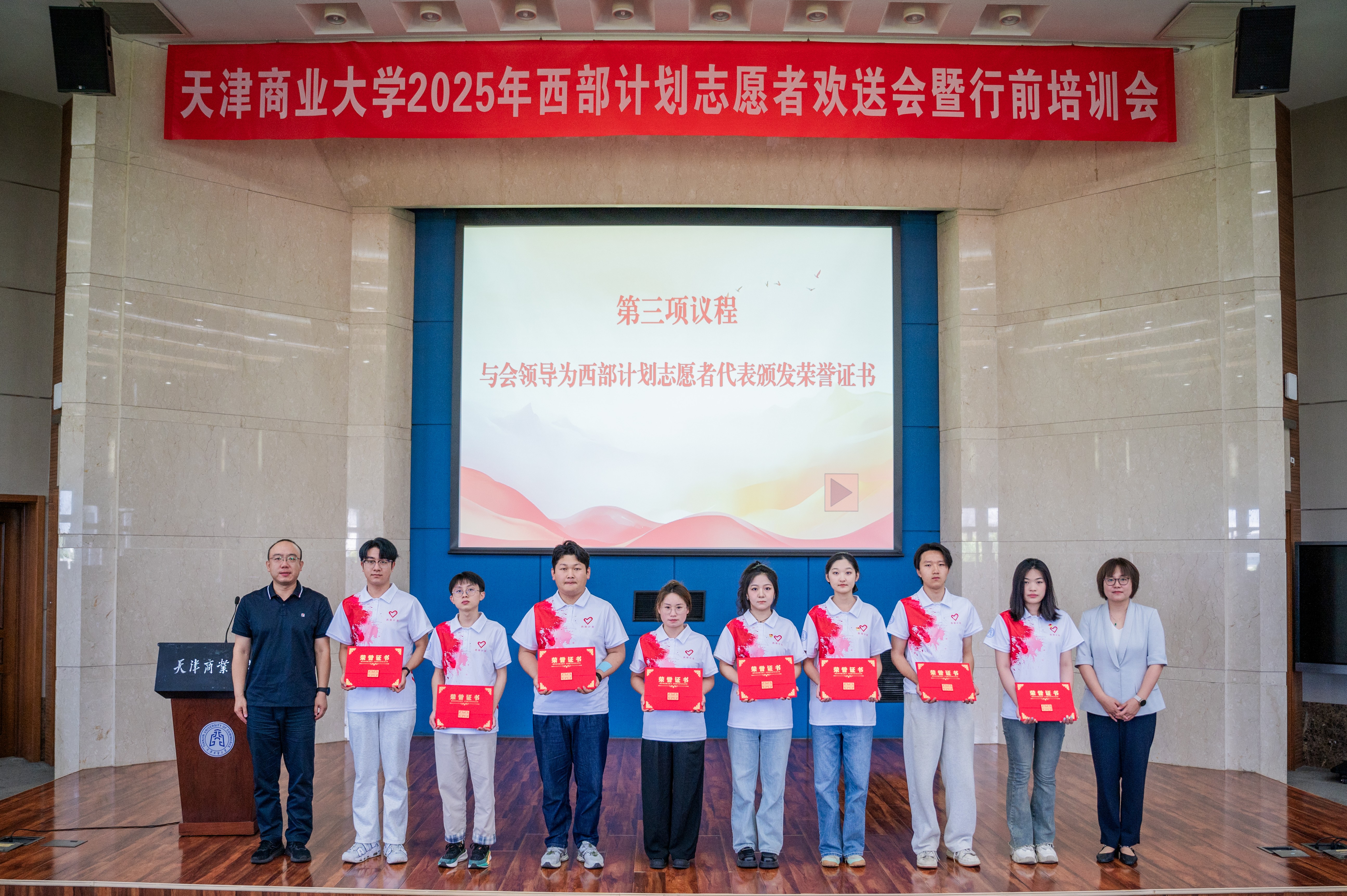 王立云向西部计划志愿者授旗,相关职能部门负责人为西部计划志愿者代表颁发优秀毕业生荣誉证书,全体参会人员观看了西部计划宣传片——《从天商出发,让青春在西部闪光》。
