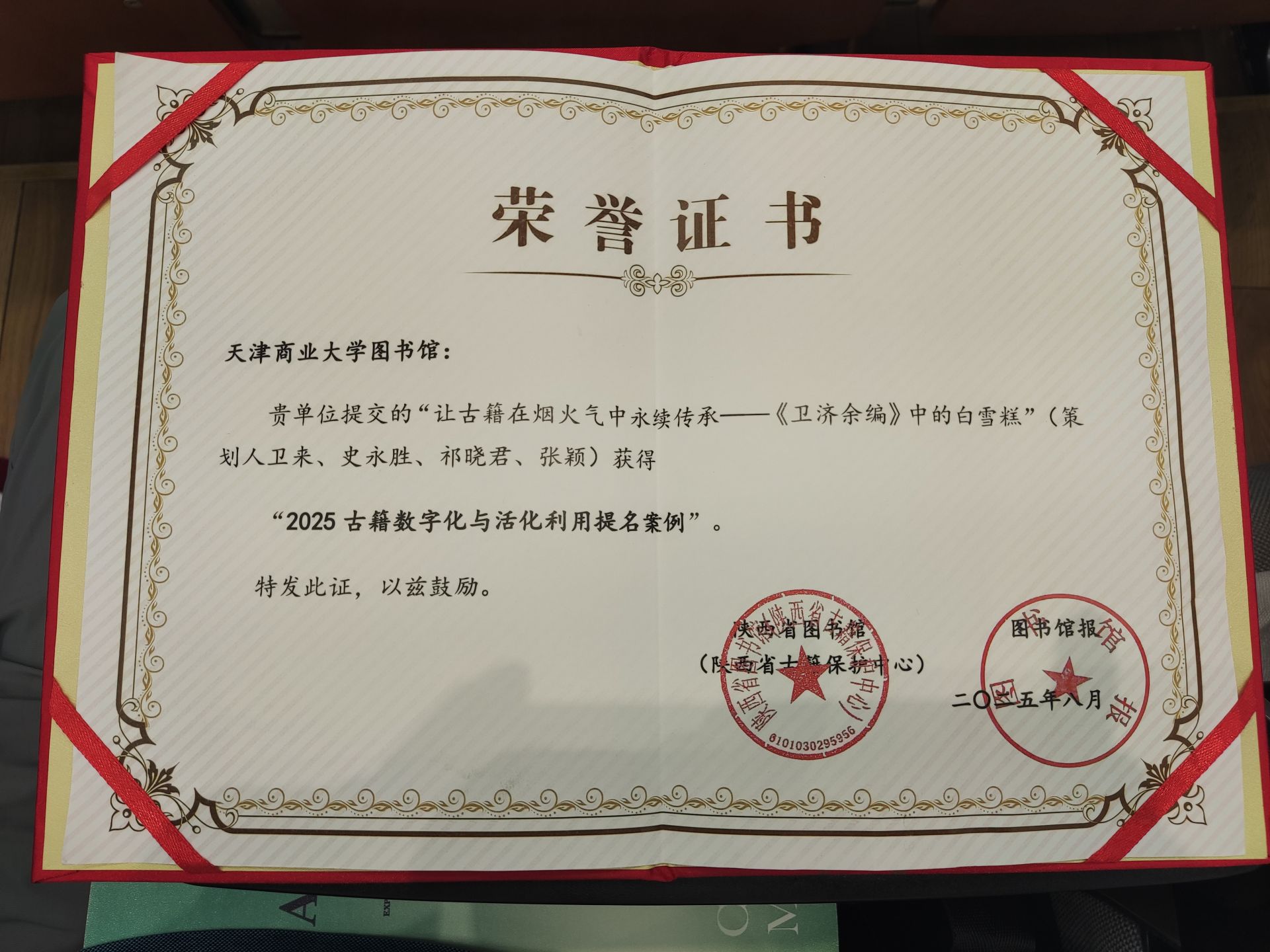 近日,由国家古籍保护中心指导、陕西省图书馆(陕西省古籍保护中心)主办、《图书馆报》承办的“2025年度古籍数字化与活化利用会议”在西安举行。beat365亚洲体育官方网站图书馆报送的案例“让古籍在烟火气中永续传承——《卫济余编》中的白雪糕”荣获2025年度古籍数字化与活化利用提名案例。
